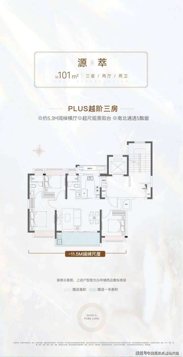 经典飞机户型+三开间朝南+餐客厨一体化+约5.3m的阔绰横厅,整体南向面宽达到约11.5m!整个户型的通透度和采光度很棒。