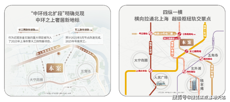 地铁18号线二期(在建)将原本不完全相连相交的四线地铁1号线、3号线、18号线、19号线(在建)横向拉通,北上海轨交因此互联,淞南将成为区域轨交的聚点;同时,本案近邻长江西路地铁站(直线距离约150米),1站江杨南路、5站复旦大学、7站五角场,便捷畅达。