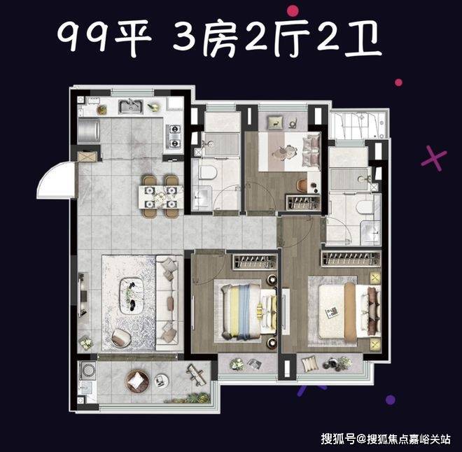 建面约99㎡的3房2厅2卫,三开间朝南+南北通透,位于楼栋的边套,主卧升级为套房设计,更适合本地客户的改善选择。☑️☑️深嘉上府售楼处电话:400 - 8377 - 020☑️☑️