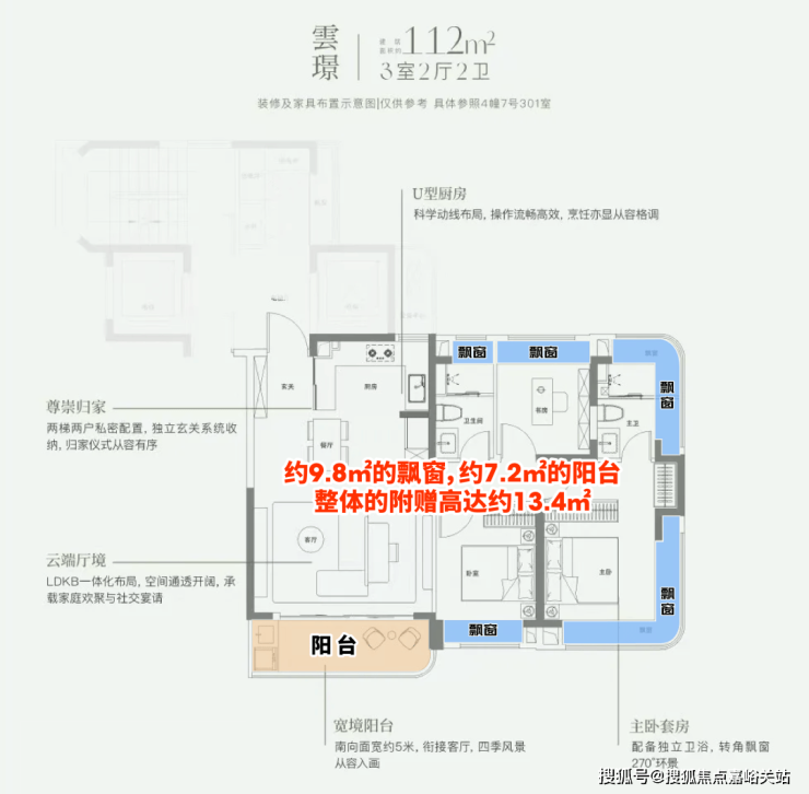 这个户型有约9.8㎡的飘窗,约7.2㎡的阳台,整体的附赠高达约13.4㎡。 这是目前上海外环沿线,是附赠率最高的一个小高层产品。