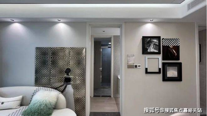 客厅和主卧都标配悬浮吊顶、无主灯设计,背景墙采用皮革和铝合金拼接,也都是实体交付的。