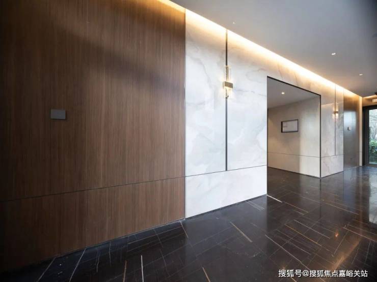 当然这样的艺术格调也从室内延伸至了公区:影木与大理石的结合,加上劳伦黑金大理石铺地,尽显尊贵。