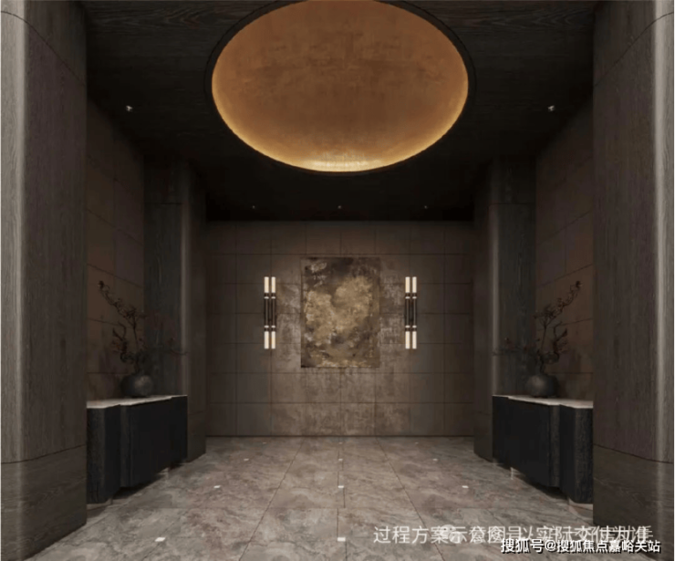约50m面宽的气派门头+酒店式入户大堂: 打造艺术格调归家。入户大堂由吴滨设计,呈现“天圆地方”的效果,方正的线条勾勒出空间的规整与大气,与顶部的圆形形成刚柔并济的视觉平衡,让每一次归家都成为一场尊贵的礼遇。