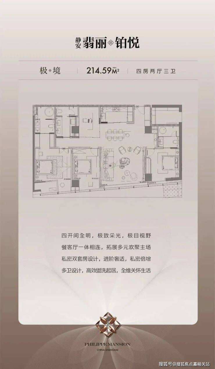 四开间全明,极致采光,极目视野餐客厅一体相连,拓展多元欢聚主场私密双套房设计,进阶奢适,私密倍增多卫设计,高效盥洗起居,全维关怀生活