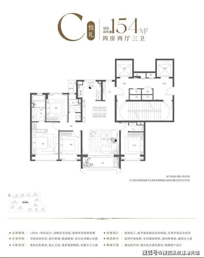 4房2厅3卫设计,整体格局方正,南北通透,四开间超14米奢阔尺度,阳光清风肆意流淌。约9.9米阔绰LDKB一体化空间,大尺度的竖厅设计,容纳多元家庭欢欣团聚。