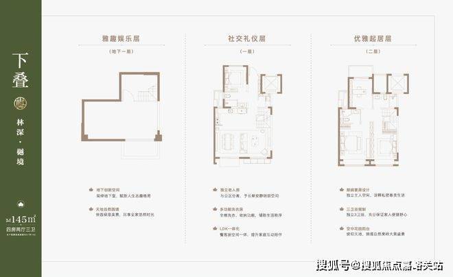 以145㎡下叠为例,四房两厅三卫全能格局,非常适合二娃家庭以及三代同堂。