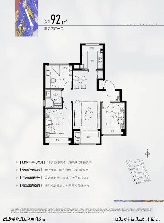 三开间朝南、方正格局,是一家三口或年轻夫妻居住的超级舒适户型。
