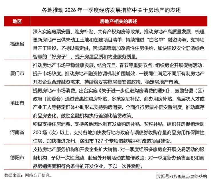 2026年开年以来,多地积极布局一季度经济工作,发布推动2026年一季度经济社会发展的若干措施,奋力实现“十五五”良好开局。各地也为推动房地产行业发展进行了系列部署,主要表现在以下几方面: