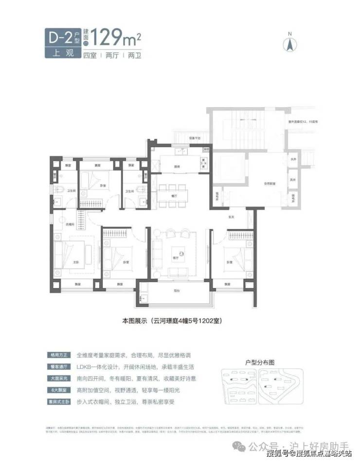 预算充足的小伙伴,可以选建面约129㎡4房,经典的三卧朝南、边套观景户型。