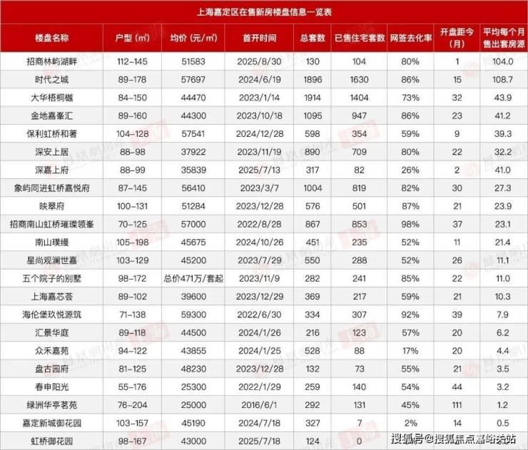进一步观察在售项目,当前嘉定在售的22个新盘中,仅有招商林屿湖畔和时代之城两个项目表现突出,月均去化超过了100套; 其余19个项目月均销量普遍低于50套,不少楼盘甚至难破20套。
