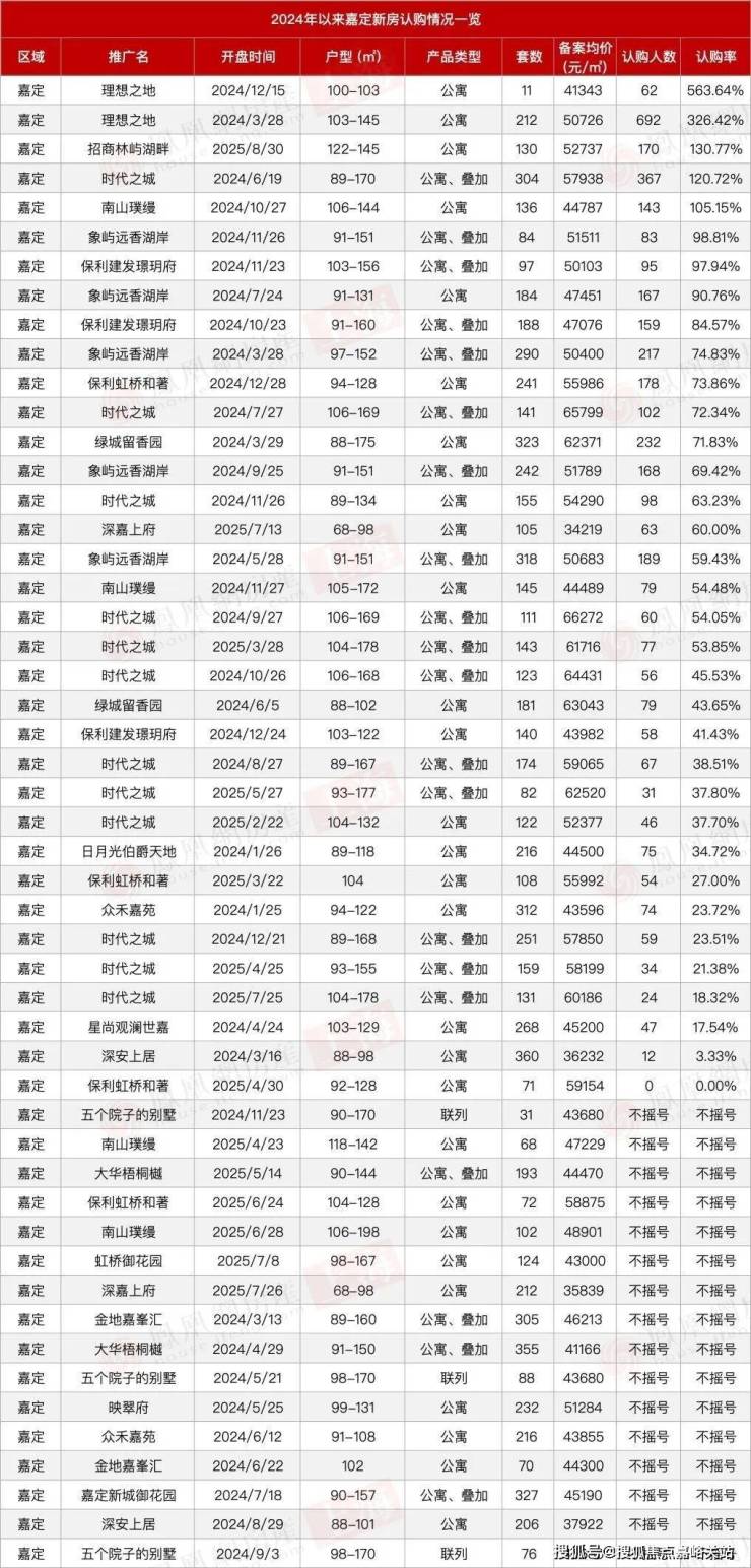 即便过去五年嘉定累计卖出42,030套房源,在五大新城中销量稳居前列,但如今的区域市场已难掩“一半火焰一半海水”的分化格局。数据显示, 2024年以来,嘉定51次推盘中仅有3次触发积分制,另有17次因认购人数不足而直接取消摇号。