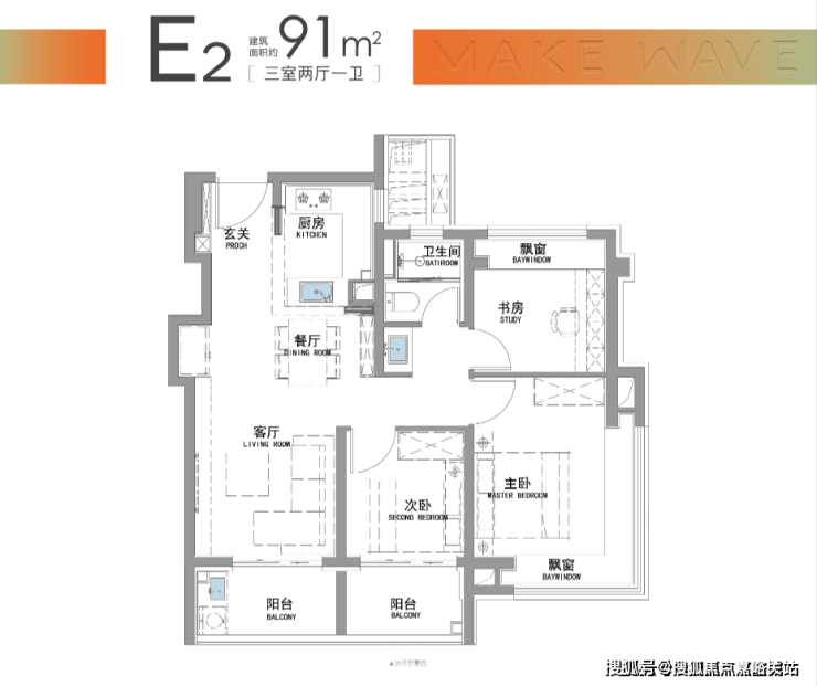 而招商·时代潮派|东屿此次建面约91㎡户型,就做出来了比市面百平户型更好的的“南向双阳台+南北双飘窗”设计。