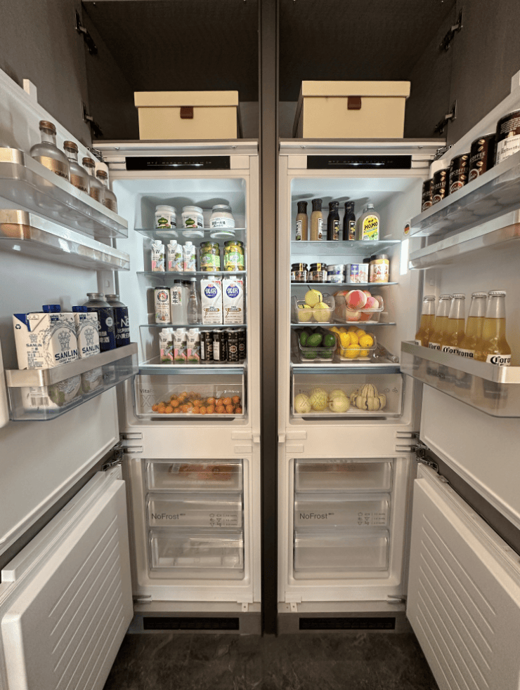 入户处,在当下常见的户型设计里,上图里的这个空间往往被作为冰箱使用,但实际上,冰箱与厨房的动线较长,使用并不方便。象屿的做法,是在这里打造成了一个完整的“700库”。