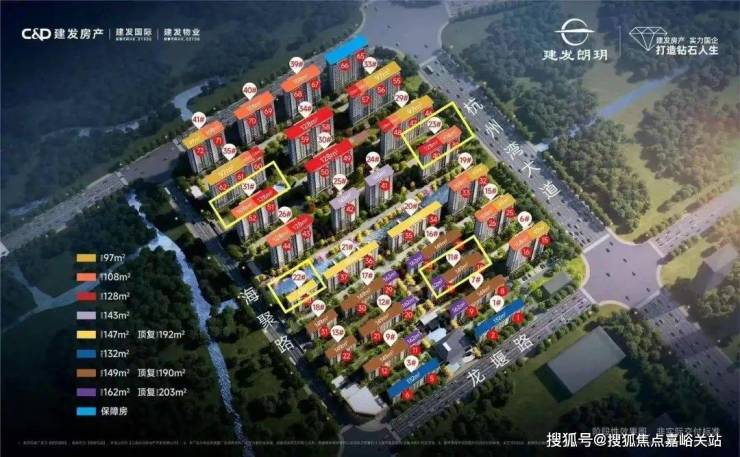 建发·朗玥是一个18万方的大型社区,容积率1.8,可售1417户, 由97-128平小高层、132-203平洋房组成。
