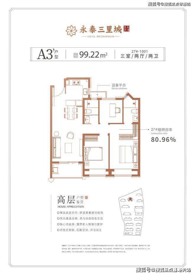 具体细节方面,项目目前只有一个建面约100㎡三房的样板间,带软装后面宽约3.3米,吊顶后层高约2.73米。