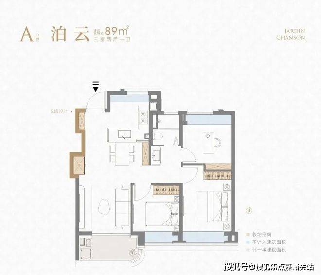 建面约89㎡3房户型,利用科学的收纳和S墙设计保障了室内空间的井井有条,又通过大量飘窗和阳台等提升尺度感,厨房也附带飘窗。