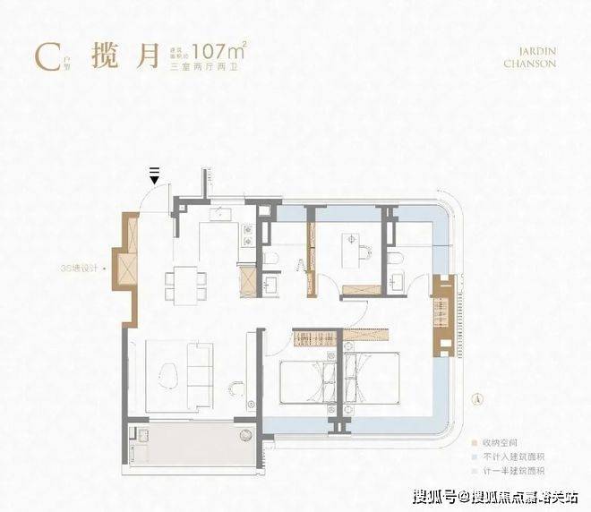 建面约107㎡的3房,客厅的面宽被拉长到了约4.7米;3S墙的设计,极大的扩容了家的储物角落;主卧、主卫双270°全景飘窗的设计。