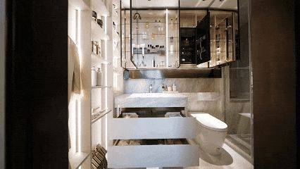 顶柜上方一面镜子,能让你清楚知道柜子里有无遗漏物品;卫生间台盆下方,特意为扫地机预留了空间;针对高处拿取物品难题,特意配置了下拉柜;针对转角深处取物,配置了转角联动抽拉组件……