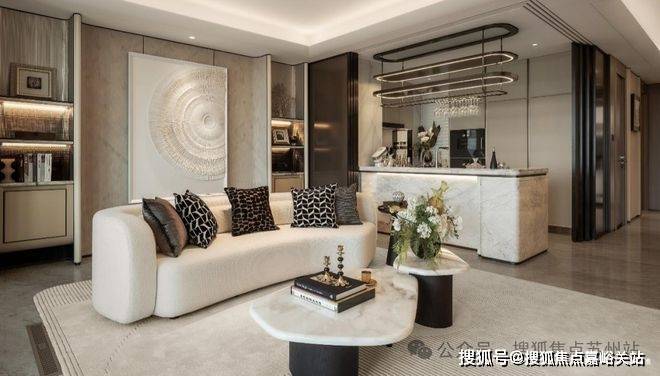 客厅背景墙的“烟雨江南”天然大理石,✨✨✨【金茂璞元】售楼处电话:4001185086✔✔✔❤❤❤不同于传统平面背景墙,通过弧度及立体的造型处理,并镶嵌不锈钢材质。