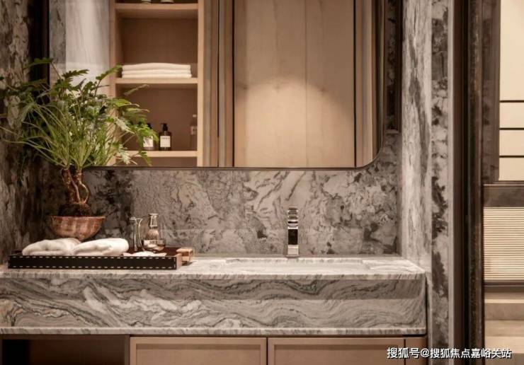 更耐用的细节 :比如在主卧背景墙上使用了 胡桃木和带有贝母光泽的装饰 ,在淋浴房用了 水云纱石材 ,这些细节都在默默提升着日常生活的质感。