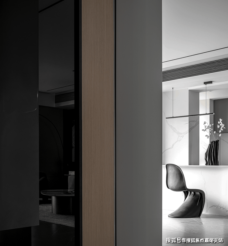 盥洗室采用独立空间,哑光黑的器具搭配大理石墙面,呈现出现代设计美感。
