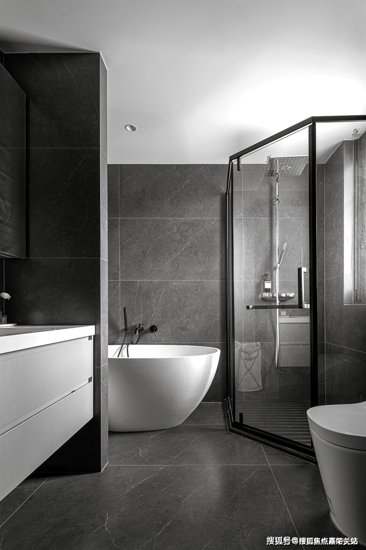 浴室黑白搭配效果出色,背景部分实用黑色,陶瓷的白色提高质感,形成美学反差效果。