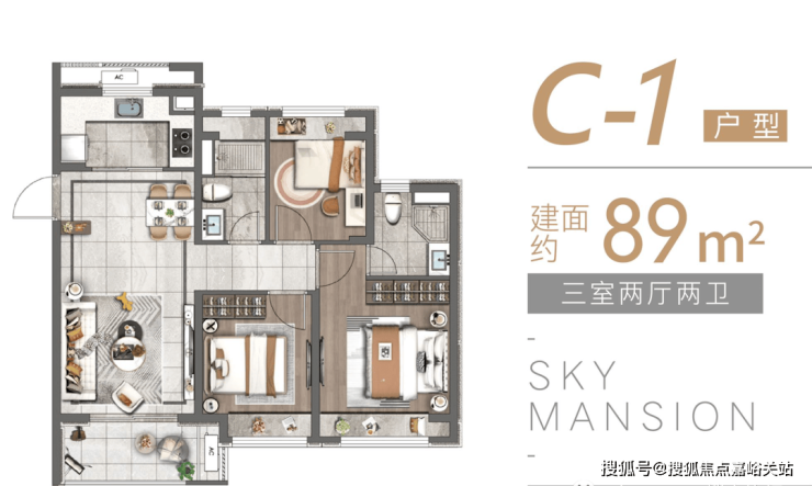 建面约89㎡(三房两厅两卫)