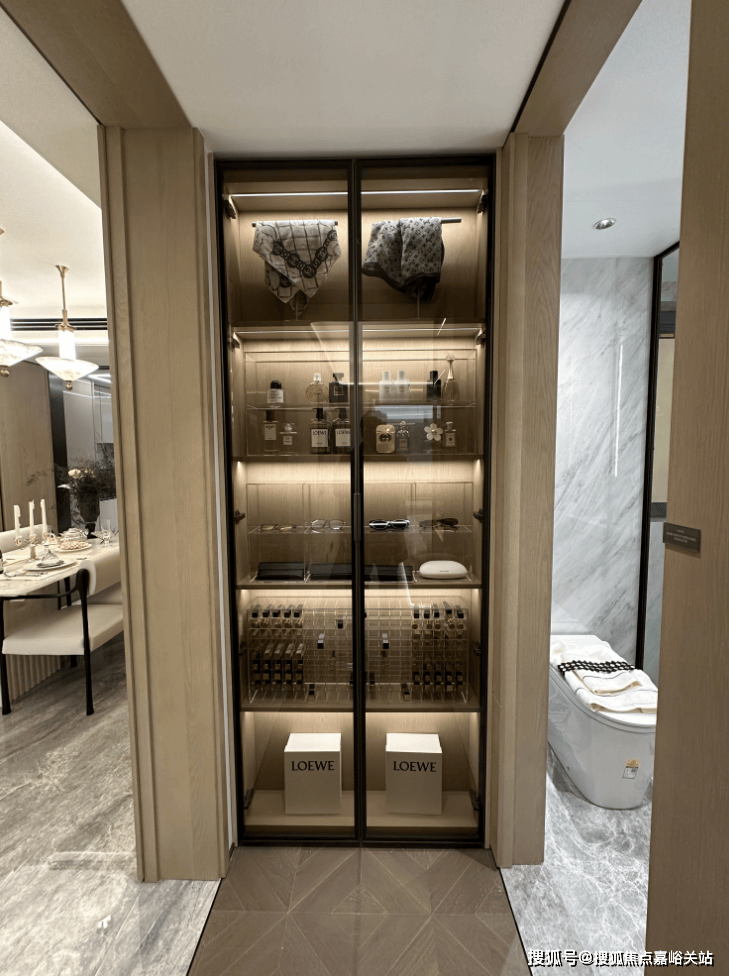 主卧,同样预留了窄柜收纳,极窄边超白玻的设计 ,颜值“能打”,女主人的包包、丝巾,男主人的机械表、摇表器、甚至高脚杯与藏酒,都可以存放于此。