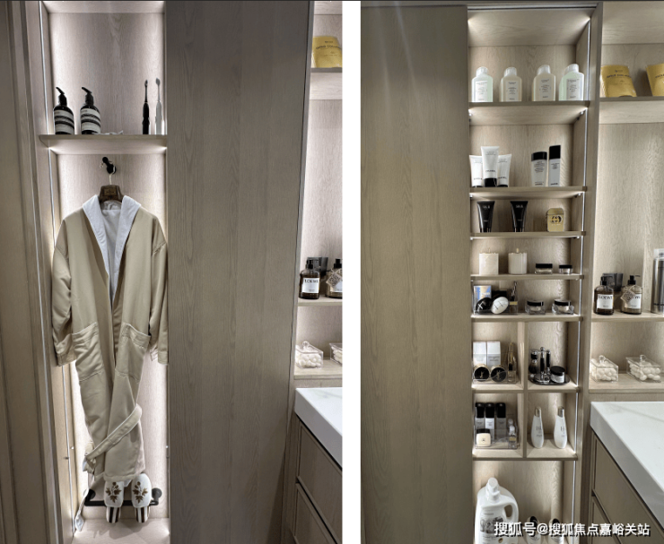 再来看次卫,平开门的窄柜,同样做了层层收纳,形状各异的化妆品、囤积的纸巾、洗衣液等等,都可以藏在这里,同时也预留了挂大衣的空间。