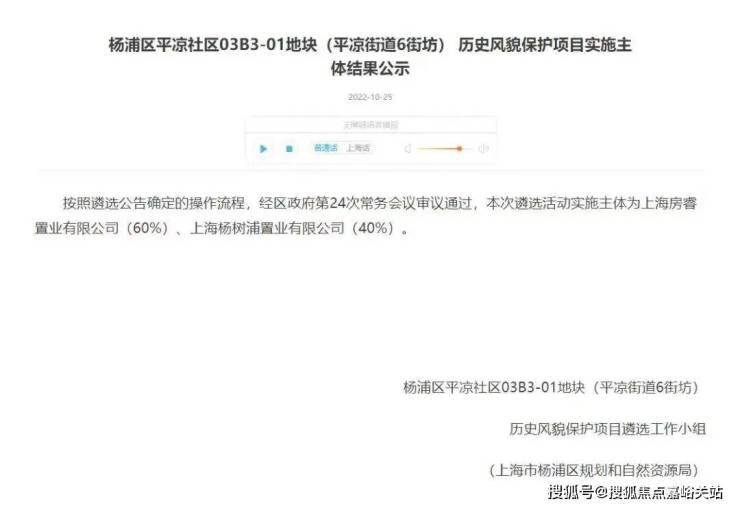2022年10月25日,杨浦区人民政府官网发布公告,杨浦区平凉社区03B3-01地块(平凉街道6街坊)历史风貌保护项目实施主体结果公示:“本次遴选活动实施主体为上海房睿职业有限公司(60%)、上海杨树浦置业有限公司(40%)。”