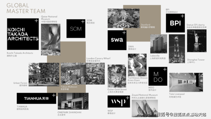 规划设计顾问 美国SOM建筑设计事务所 ,作品有迪拜的哈利法塔、上海金贸大厦等全球知名建筑;建筑立面设计由 澳大利亚KTA 公司掌门人 高田浩一先生亲自担当设计 ;景观设计美国SWA,设计了美国谷歌总部、斯坦福大学景观,及古北黄金城道景观等;灯光设计公司——BPI,承担了自由女神像照明工程、上海中心等;