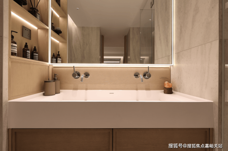 主卫淋浴 、双台盆,选用 国际一线品牌龙头与顶喷花洒 ,在此基础上,还全面做了 “管道的消失”工艺 。