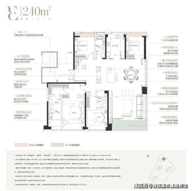 建面约240㎡四房三厅三卫,由国际知名室内设计师吴滨执笔,以厨电、收纳、家政、智能、幕墙、定制“六大满配”,实现了从空间功能、材质美学到身心体验的全维革新: