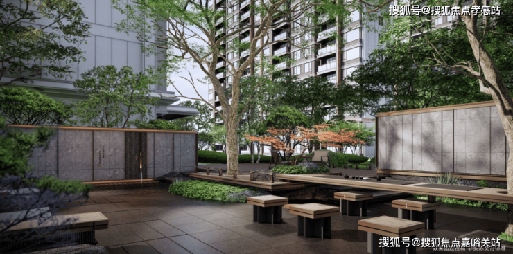 雅致石院与中庭古树相映,植物组团错落有致,营造出清逸山水园林之美,唤醒人们对林荫树下休憩闲聚的场地记忆。