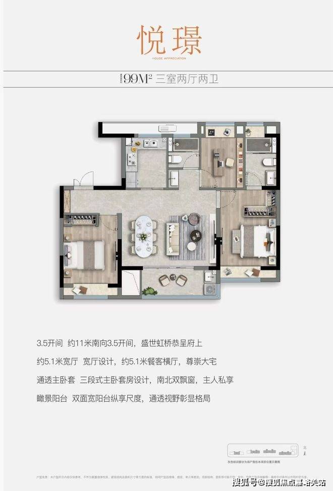 户型点评:百平左右的户型打造三室很常见,但能同时做到南向3.5开间属实难得;餐客横厅更是达到了约5.1米的宽度设计,大幅提升了生活舒适度、以及实用性;主卧套房,涵盖步入式衣帽间与独立卫浴,南向自带飘窗,缔造尊贵私密私享。