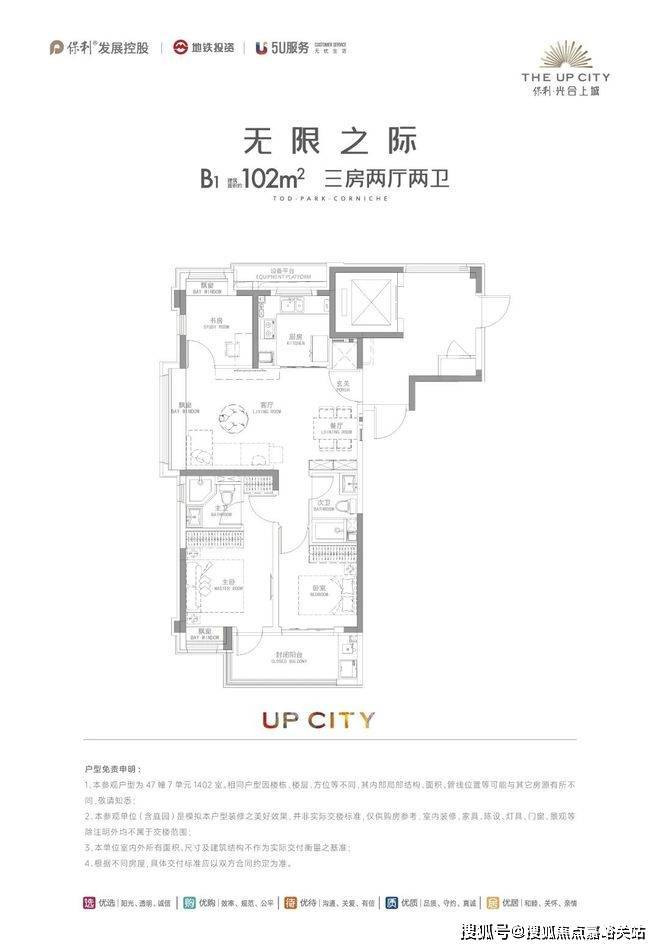 建面约102㎡三房双南卧+大阳台,空间利用极致,主卧套房带独卫,南北动静分区,直接把市场同级别产品拉开一档。