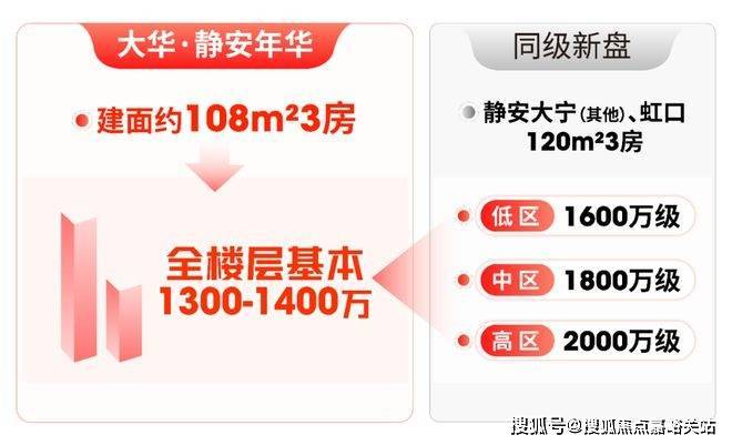 静安大宁、虹口新盘,3房总价约1600万起,若想买中区房源,要到1800万级;而大华·静安年华108㎡3房,全楼层总价基本1300多万,门槛温柔太多。