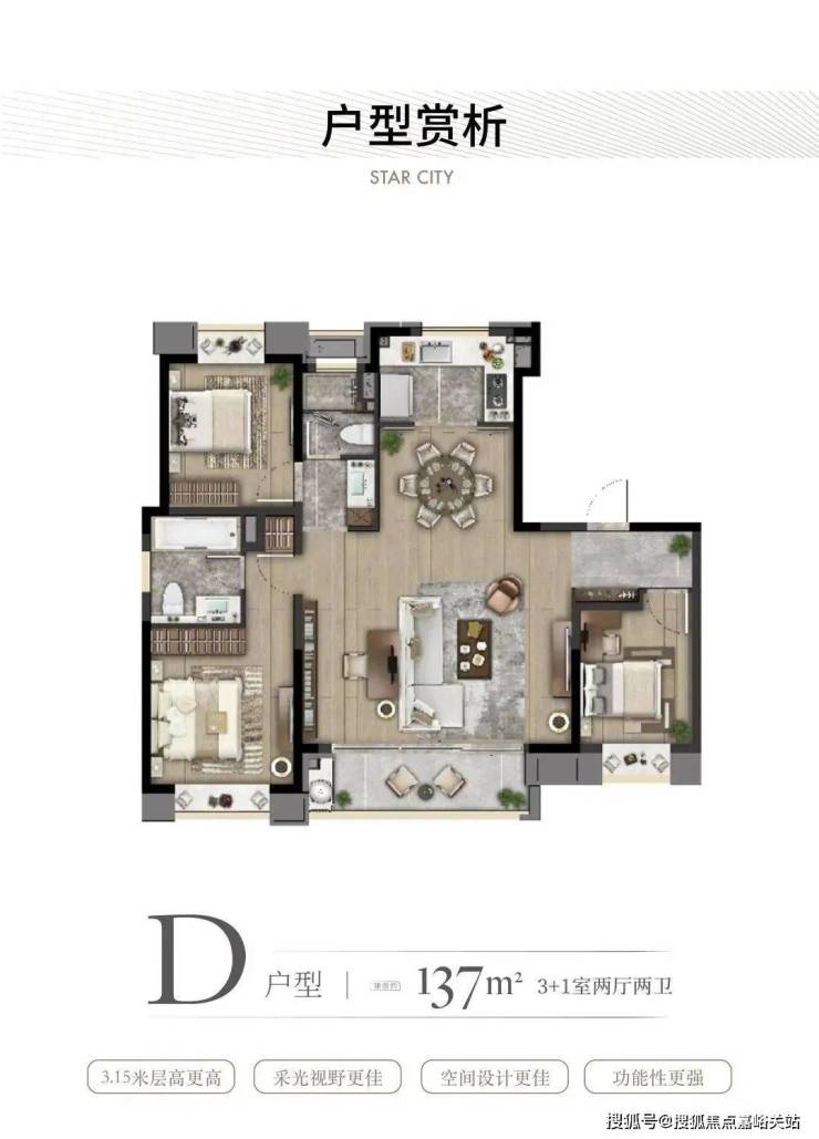 · 约137㎡户型:格局上做到了三开间朝南+南北通透,大尺度的奢阔横厅设计串联南向观景大阳台,整个公区的视野无比通透;主卧套房,保证了业主的尊崇感和私密性!