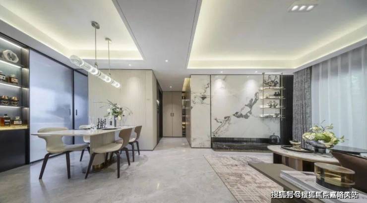 客餐厅一体化,南连同尺度宽景阳台,将生活的奢度打开。金茂定制壁布或墙纸交标结合 芬迪白岩板客厅背景墙,地面采用马可波罗(或同等品牌)大板砖,以定制设计感提升空间立体感。阳台外窗采用 大面积窗墙比,使得室内整体采光面、亮度、通风效果得到提升。