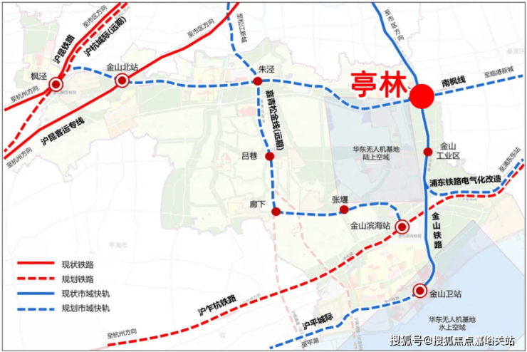 与奉贤、松江两区是邻居,到城央的直线距离,可以类比松江新城与奉贤新城。尤其是金山亭林,作为更靠近城央的地区之一,更有着先天的地理优势。