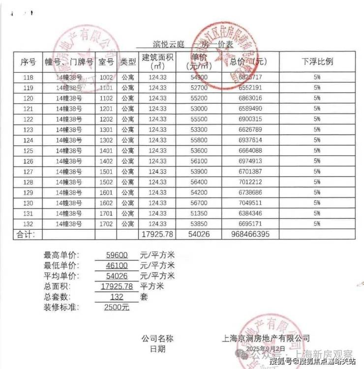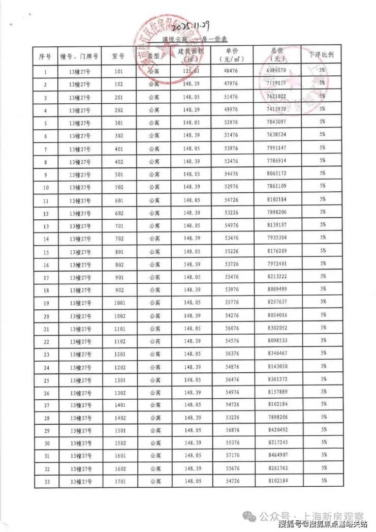上期一房一价表如下: