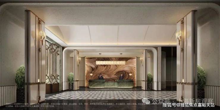 首先,会所的入口设计奠定了整个空间的艺术基调。 实景中,地面常采用 天然石材的拼花工艺 ,不同色调的石材精准对缝,形成简洁而富有层次的几何图案,彰显低调的仪式感。
