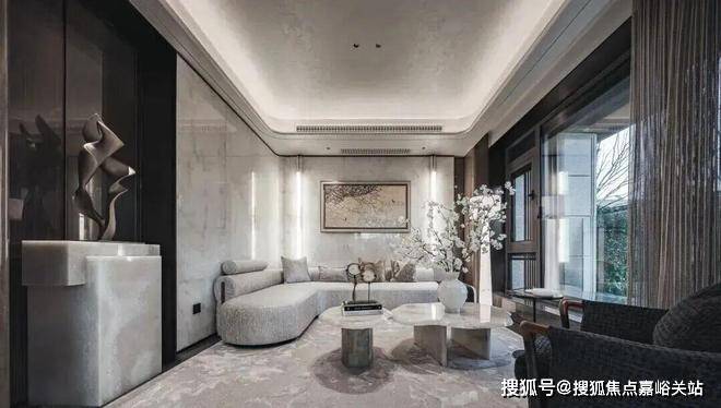 首先是奢石含量极高,从入户处的玲珑玉拼花与透光云石辉映,到翡翠绿奢石墙景、再到发光云石装饰点亮归家路,石材的典雅贯穿始终。