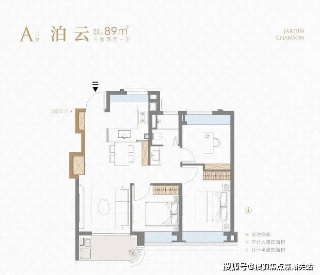 ①建面约89㎡3房2厅1卫户型:
