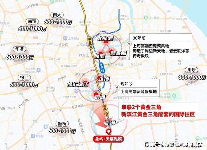 众所周知,项目高端城市资源高度集中在2大滨江黄金三角:由外滩-陆家嘴-北外滩构成的传统中央商务区,由前滩-徐汇滨江-世博构成的新兴中央活动区。其他所有板块几乎都是经由它的价值辐射。换言之,谁距离他们更近通勤更快谁就更有未来!