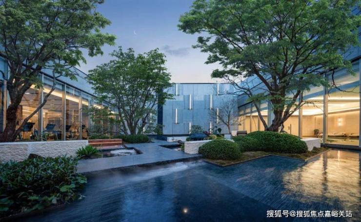 会所还拥有下沉水景庭院,与周围建筑融为一体,以静水、原石、浮桥、古树、自然微地形为精神媒介,将自然与松弛感带给社区。