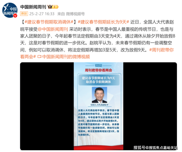 27日,“建议春节假期取消调休延至9天”的相关话题引发关注热议。
