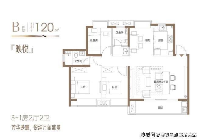 『映悦』约120㎡3+1房2厅2卫:3+1灵动空间为成长型家庭定制,容纳万象;奢阔横厅,阳光与美景,映见人生宽境;客厅与开放式书房相融,开启生活格调;IMAX巨幕观景阳台,邂逅流动的四季诗意;四面宽向阳·全明格局·全系飘窗,向美而居。
