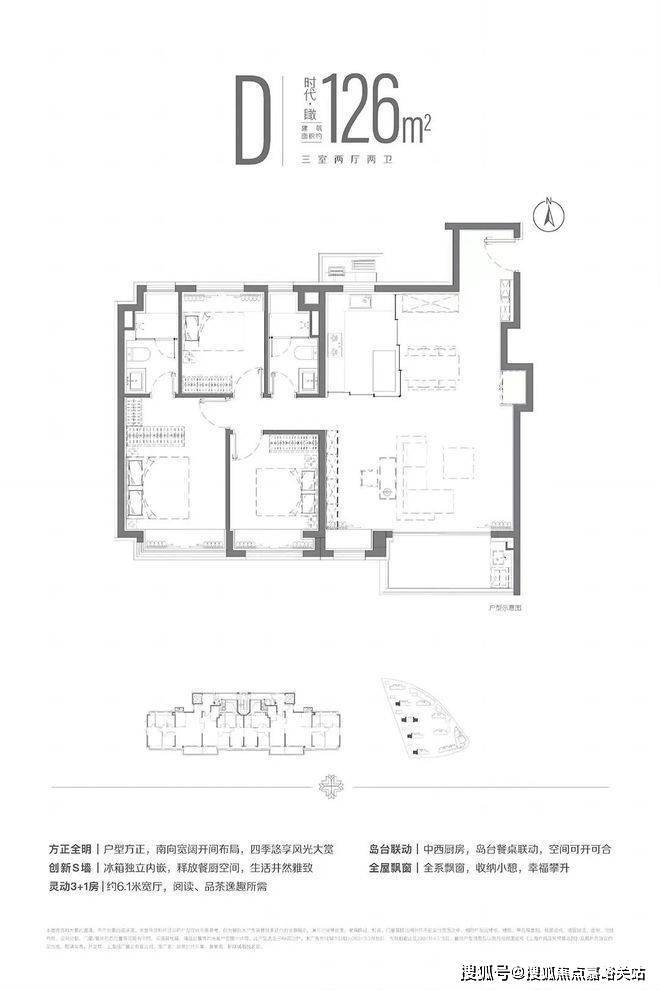 建面约126平的三房两厅两卫,在这个面积上做横厅大三房,整体的空间感和尺度感很不错,适合改善型家庭。
