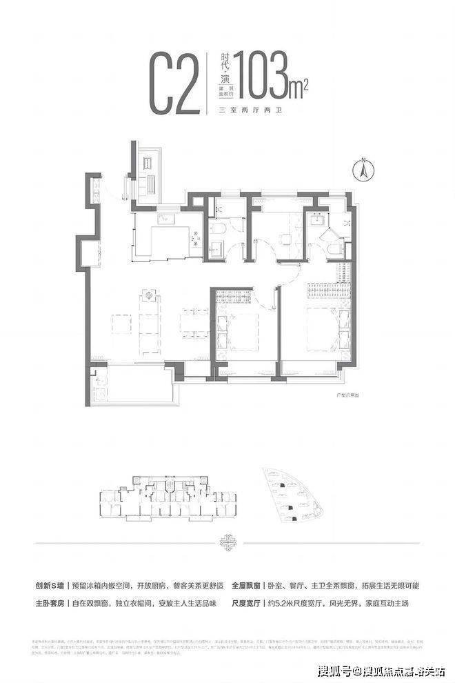 建面约103平的三房两厅两卫,做到了南北通透和大横厅设计,并且是横厅还是比较亮眼的。